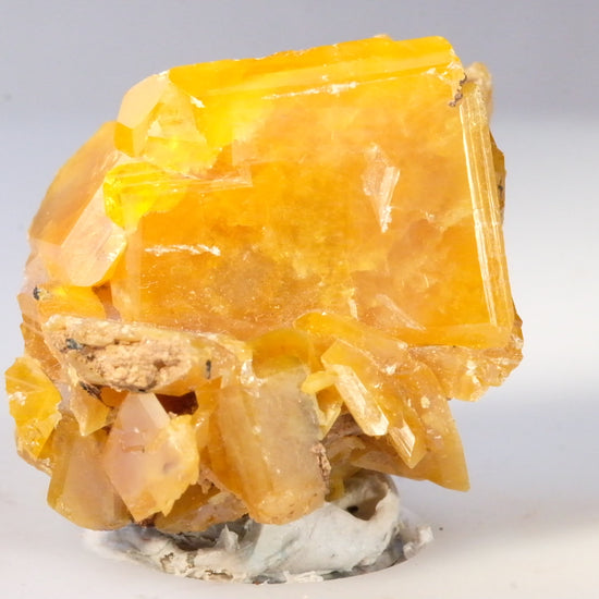 An eye-catching cluster of mirror-like, lustrous, yellow-orange crystals presenting uber-sharp, beveled edgework. There is some minor clipping to secondary crystals, however, the showpiece crystal is nicely intact. Sourced from a 40-year-old collection.