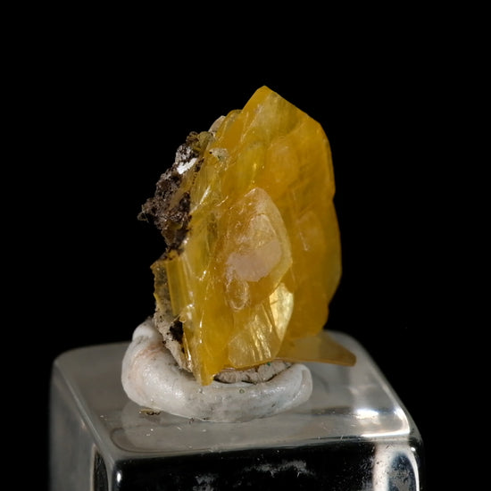 A flashy, multi-faceted, gemmy compound crystal with mirror-like luster and the classic “windowpane” transparency, from the famous Defiance Mine of Arizona, from which specimens of national museum quality have been sourced. This lovely butterscotch-colored piece was probably collected in the 1970s. The piece is notable for its curved crystal faces, which impart a pearlescent luster and internal fire when rotated in the light (see video). There is minor nipping, as is very common for these “old-timer” pieces, which is not really apparent to the naked eye.